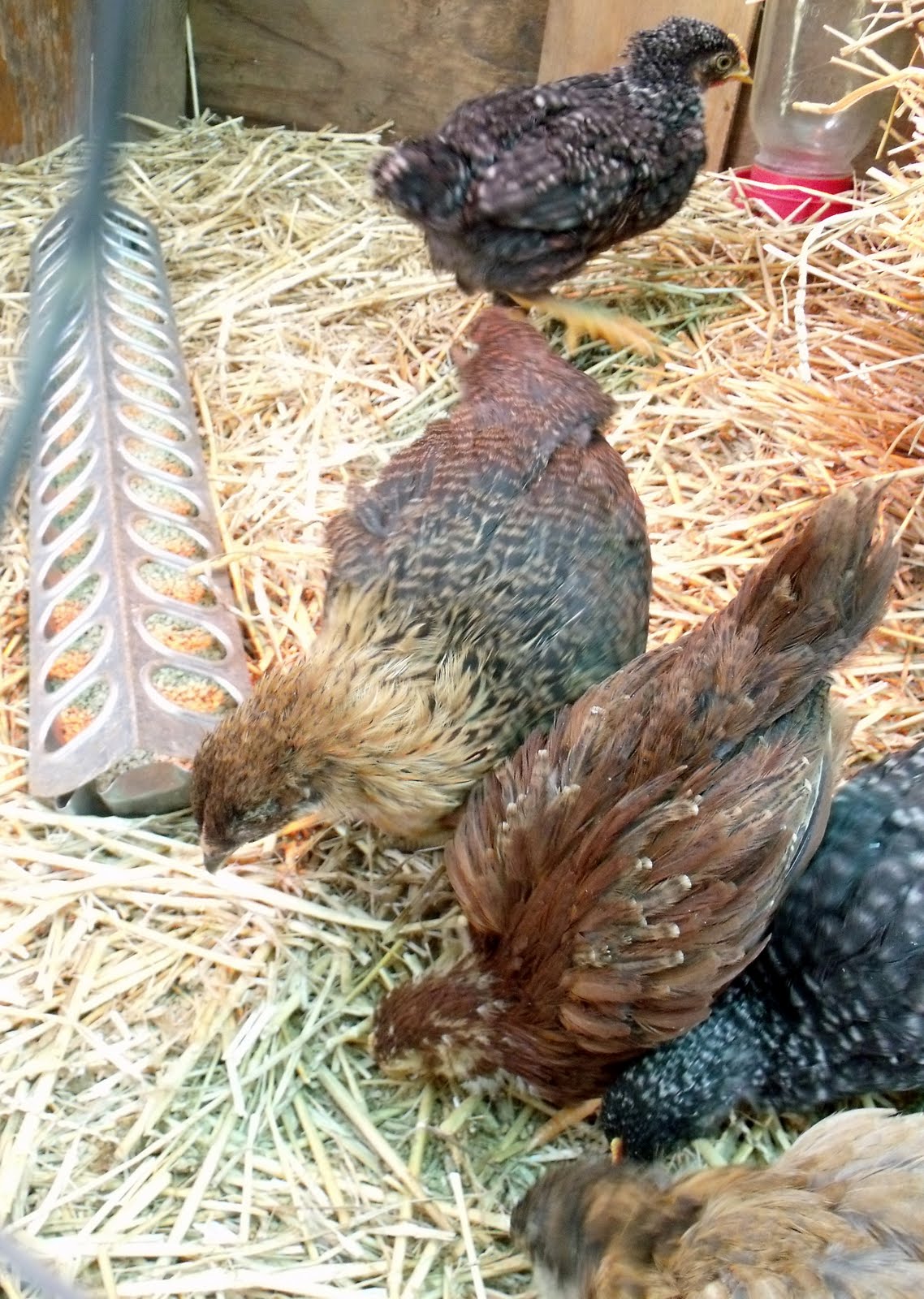 Here's more of the new flock, including the little black Banty on the left next to Punky Rooster Rooster Cogburn. We named her Paquita, cuz she's just little! There's another Auracana of which there are two, a Barred Rock, one of two Rhode Island Reds, and one of the two Golden Sex Links. They don't have names yet, but it's nothing personal, as most of the babies don't even have names yet, and we've had them for over a month now.